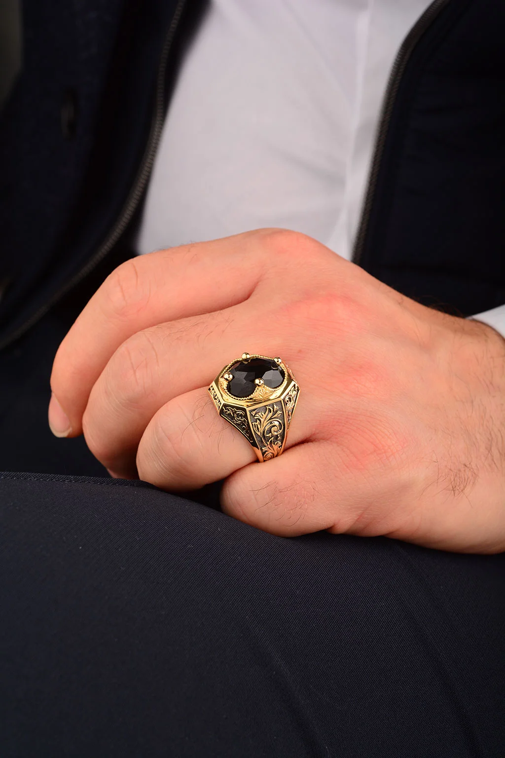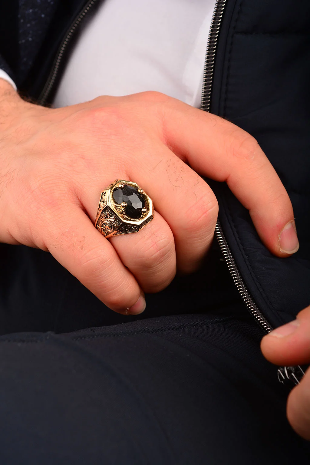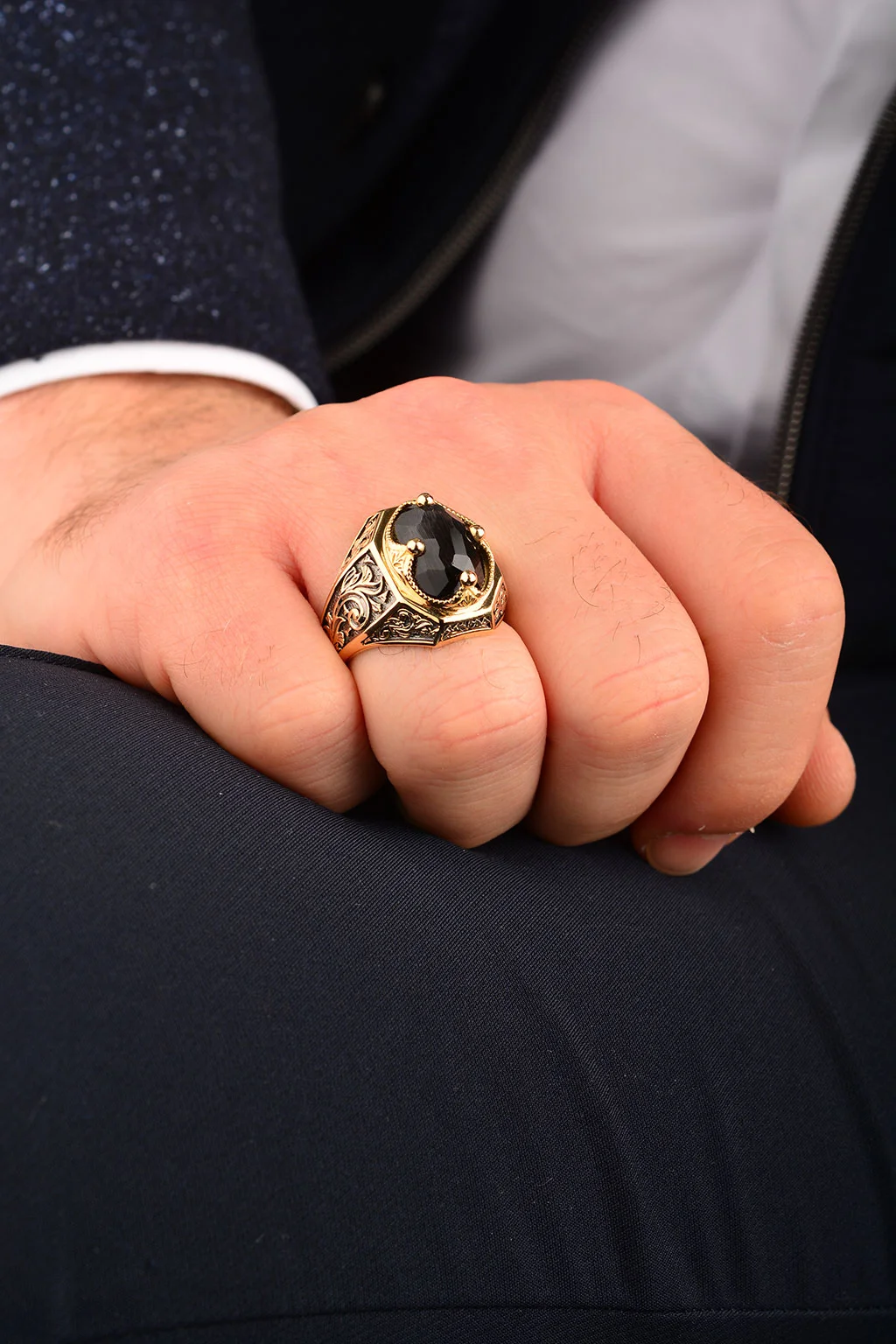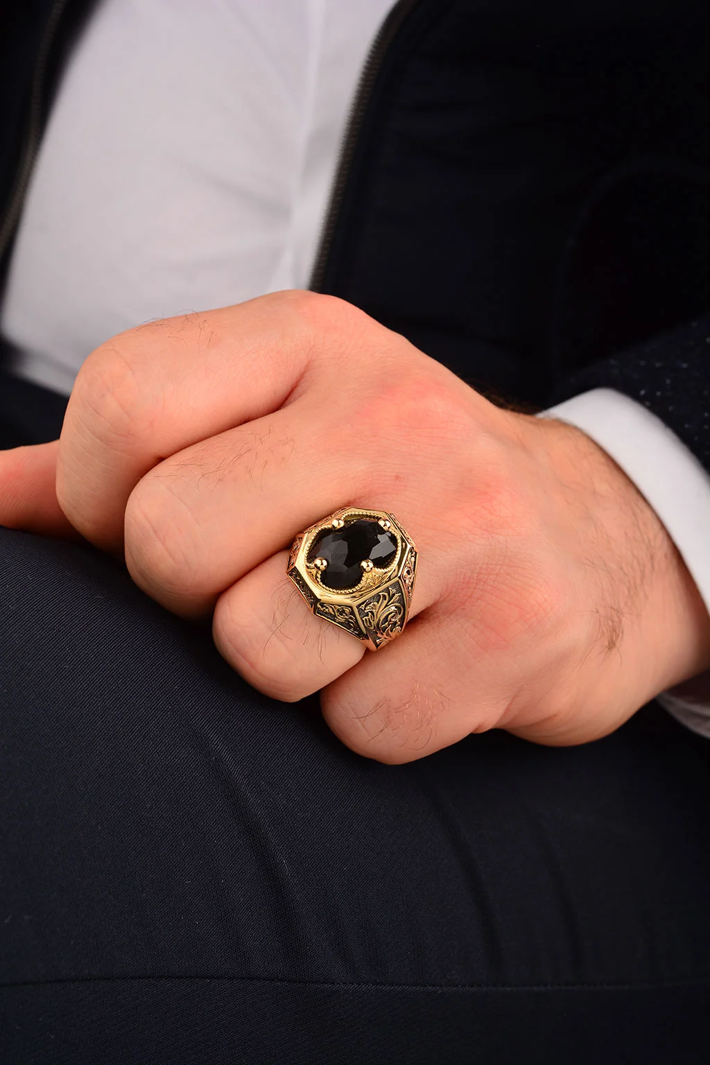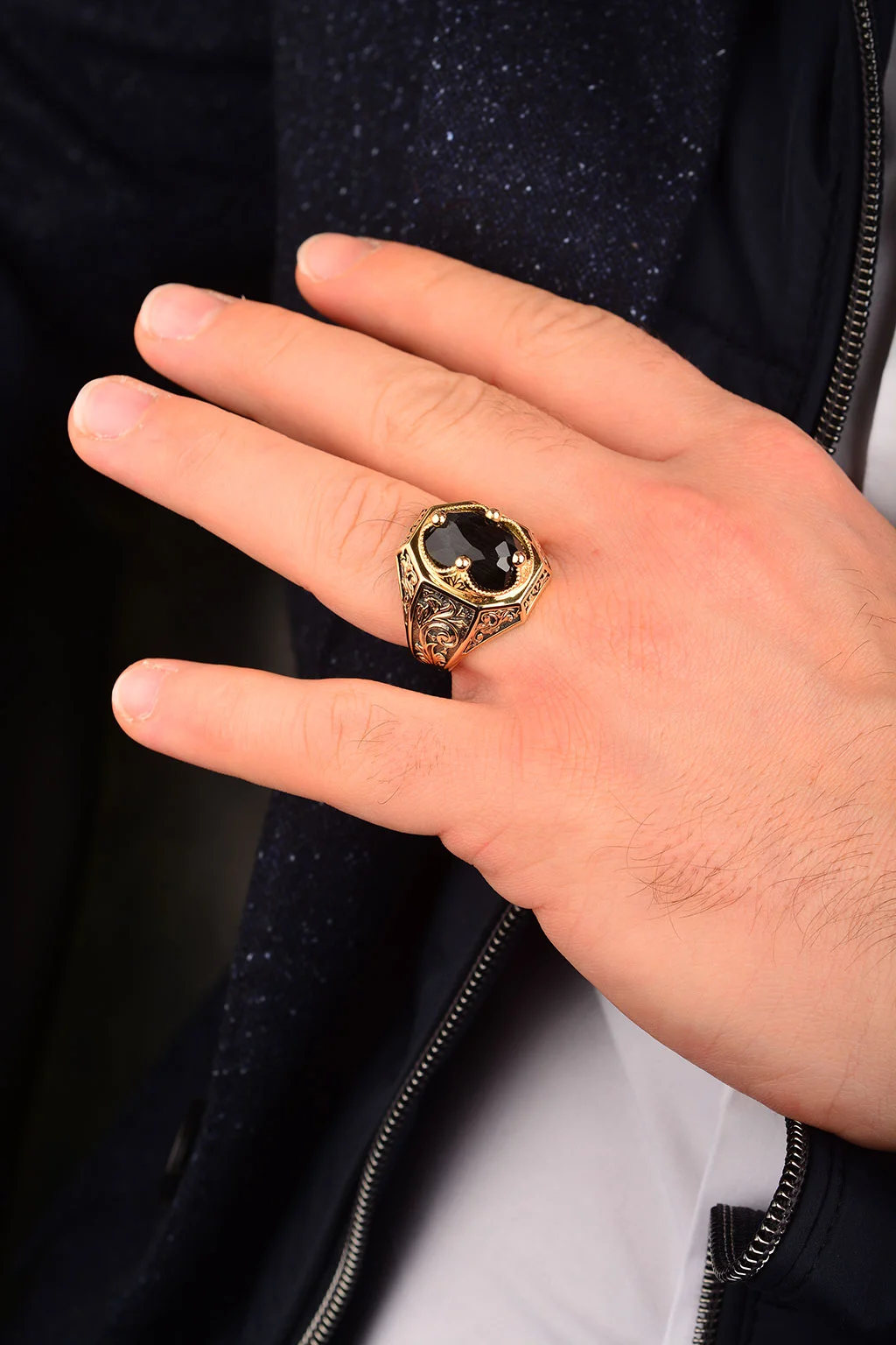 Cebeci 14 Ayar Siyah Taşlı İşlemeli Erkek Yüzük