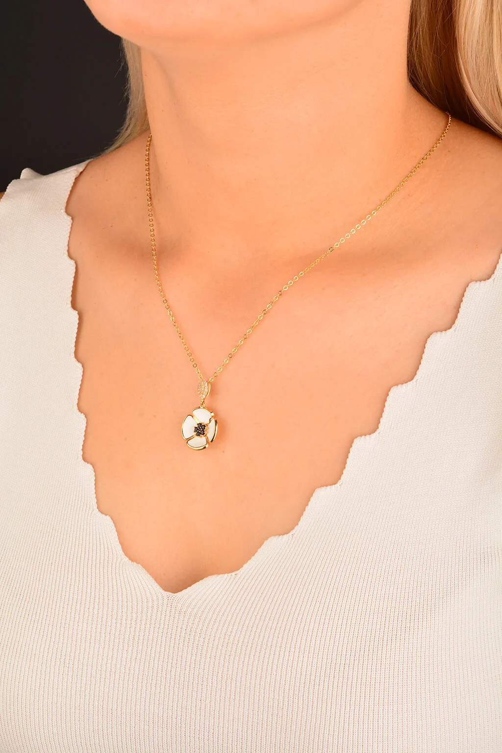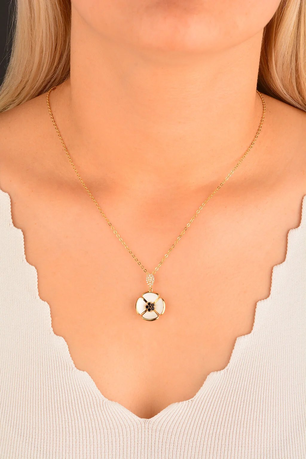 Beyaz Mineli Çiçek Altın Kolye ile bakımlı ve şık olmanın lüksünü ekonomik fiyatlarla yaşayın. Kalite tutkunu ve mücevher taşımayı seven kadınlar için en ideal seçenekler bu alımlı dünyada sizleri bekliyor.