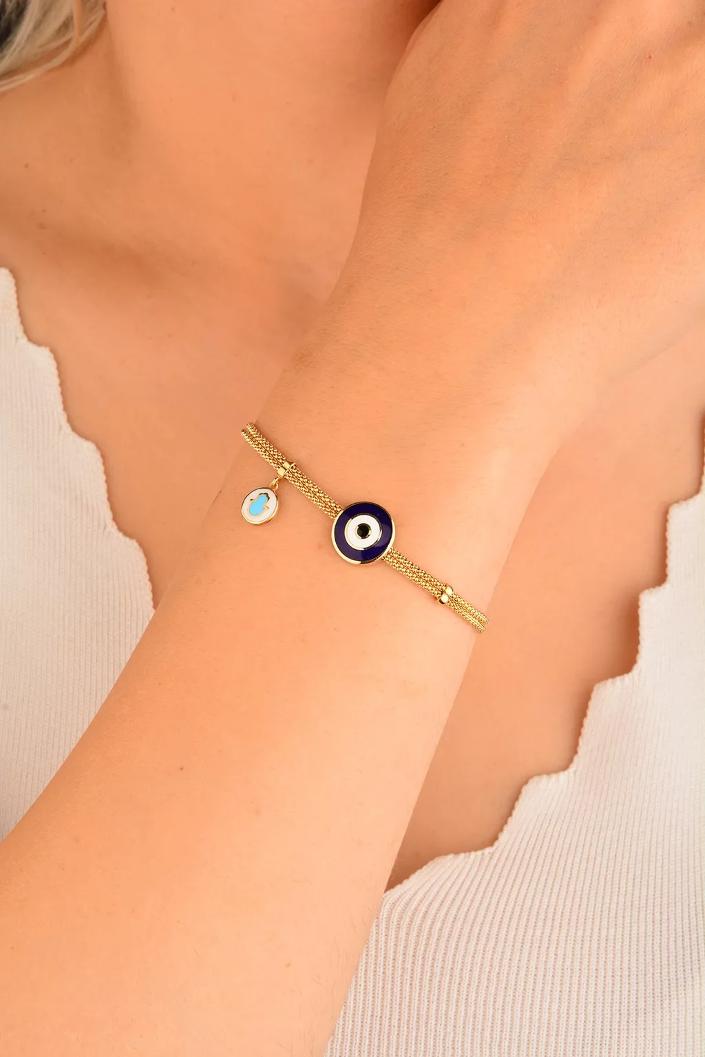 Cebeci 14 Ayar Hasır Zincir Nazarlı Altın Bileklik