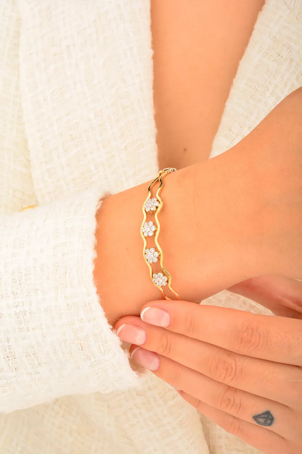 Cebeci 14 Ayar Papatyalı Kelepçeli Beyaz Altın Bilezik