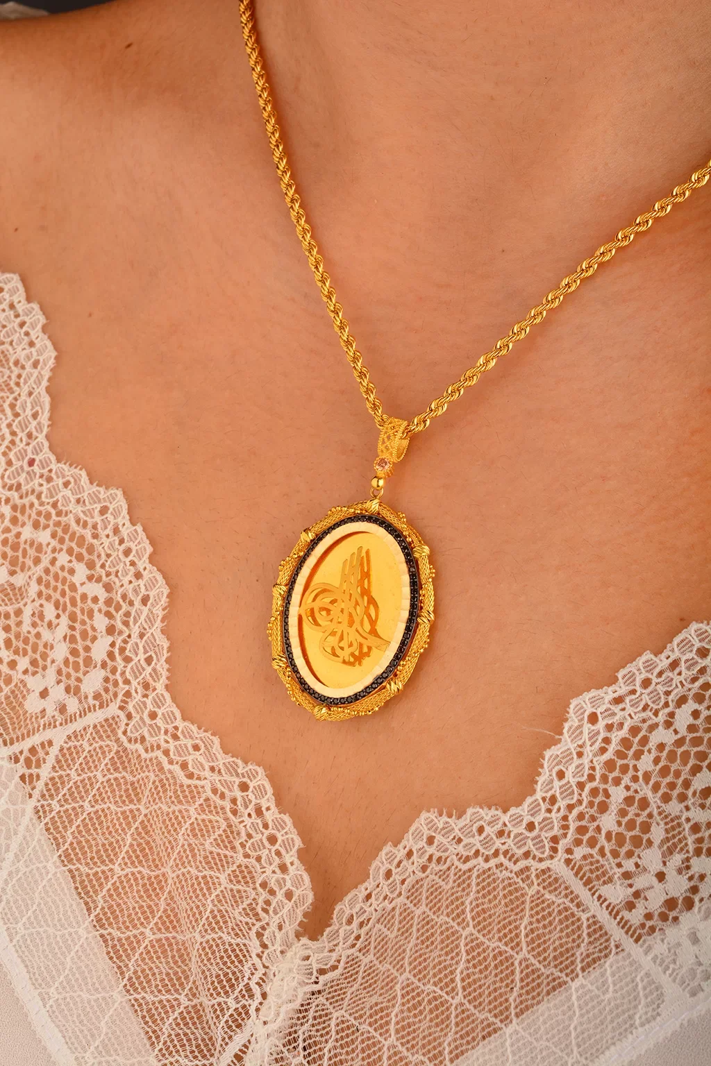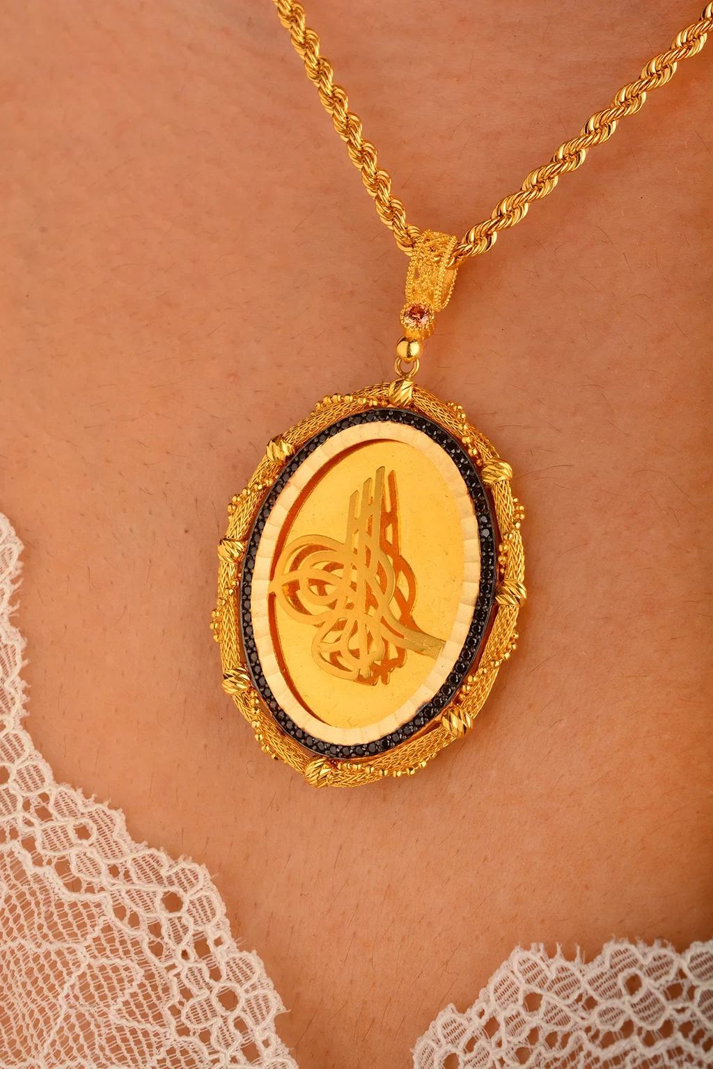 Cebeci 14 Ayar Siyah Taşlı Tuğralı Altın Kolye Ucu