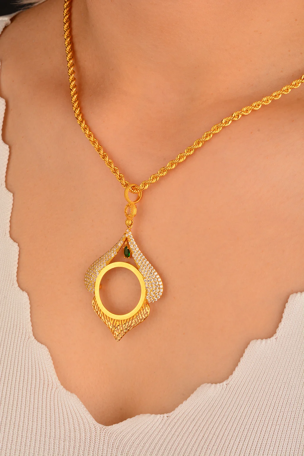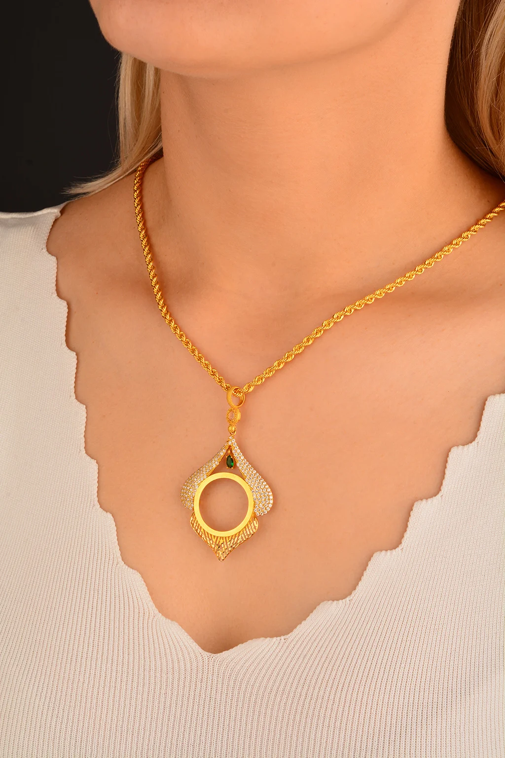 Cebeci 14 Ayar Yeşil Taşlı Çerçeveli Altın Kolye Ucu